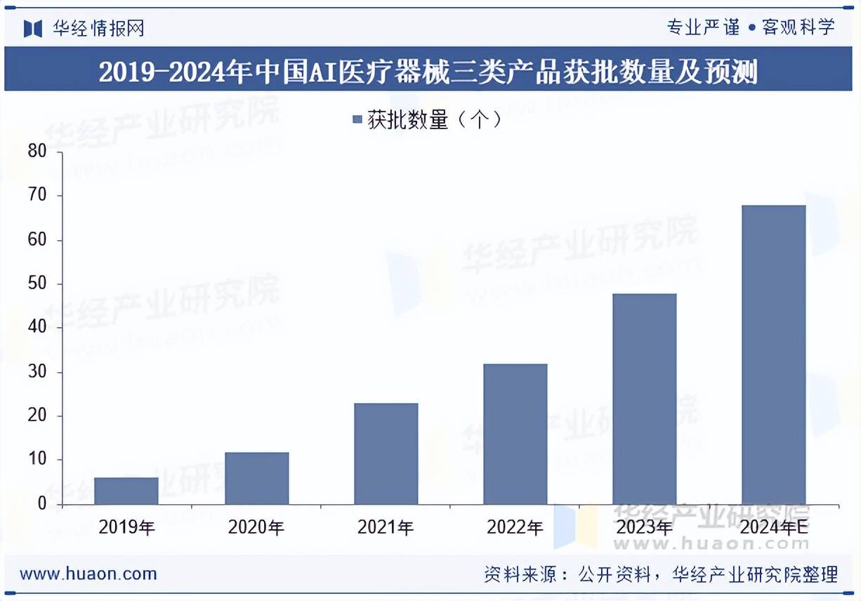 自2020年1月,科亚医疗首获医疗器械三类证,标志中国AI医疗器械进入商业化阶段,近几年随着监管路径的清晰化及行业发展走向成熟,人工智能医疗器械获批三类证速度加快。从获批数量来看,AI医疗器械领域产品三类证获批数量已从2019年的6个上升至2023年的48个。